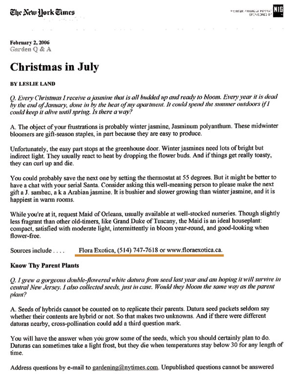 Flora Exotica was mentioned as a supplier for Jasmin sambac 'Maid of Orleans' and 'Grand Duke of Tuscany' in this article in the Home and Garden section :